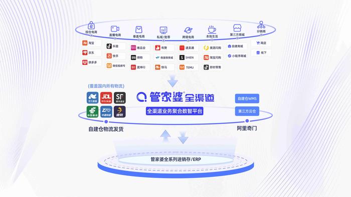 无论您的销售渠道布局在各电商平台、第三方商城或是云仓、其他线上线下渠道,管家婆全渠道通过一个系统实现全局一体化管理,业务数据完整清晰,自动同步至管家婆ERP系统,实现线上线下业务协同发展,助力企业数字化转型。