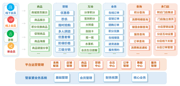 提供会员零售商城、会员积分商城、服务消费商城、会员零售营销、裂变、分销、会员互动、会员消费分析、营销决策助力等诸多功能。
