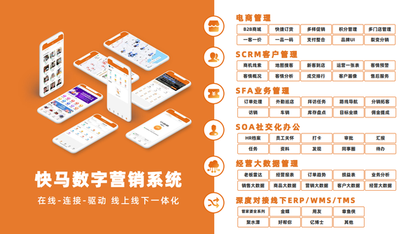 企业数字化营销管理系统,通过整合商城系统EC、客户关系管理SCRM、业务管理SFA、社交化办公SOA、大数据分析BI、进销存ERP等6大体系,为企业量身打造线上线下,内部外部一体化管理平台,提供企业数字化转型一站式服务。